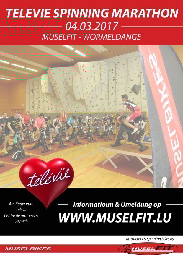 Am Kader vum Télévie organiséieren de Muselfit zesummen matt de Muselbikes e Spinningmarathon iwer 4 Stonnen den 04 März 2017 zou Wuermer am Muselfit.